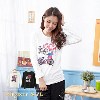 【S-7L熊衣褲語】腳踏車印圖長袖圓領棉T F66(白、黑S-2L)