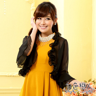 【白色戀人中大尺碼】黑色木耳邊雪紡喇叭袖披肩外套
