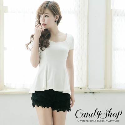 CANDY小舖 五角方領傘狀素面棉質短袖上衣(白色)