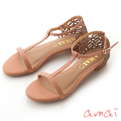 amai復古燒花感低跟涼鞋.T字方跟.珊瑚粉