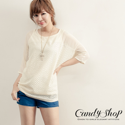 CANDY小舖 圓領外罩鋸齒網洞兩件式米白棉質上衣