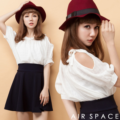 AIR SPACE 格紋挖肩打結短袖上衣(氣質白)