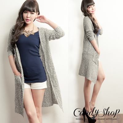 CANDY小舖 無領開襟雙口袋灰色針織長袖長版外套商品網址: