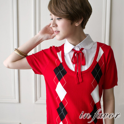 【in favor】格紋繫帶襯衫領假兩件-優美紅