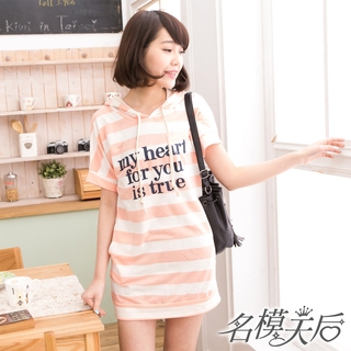 【名模天后中大碼】雙色條紋英文字母連帽洋裝(粉紅)