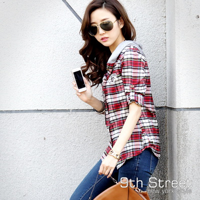 【9th.Street】美式連帽格紋徽章襯衫