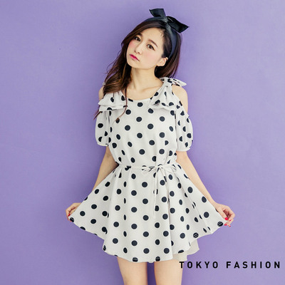 東京著衣 圓點蝴蝶結挖肩綁帶洋裝-S.M(共二色)-4012241