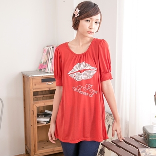 【衣心衣意中大尺碼】酷炫造型.水鑽嘴唇圖印長版上衣(磚紅-淺藍A3160)