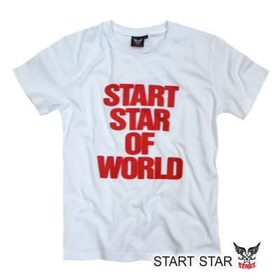 Start Star 炫眼文字圓領T(白) 以網點粗細手法展現文字暈眩的模胡效果 搭配夏日絕對醒目的焦黃色調~ 細膩的繪製技法十分叫人玩味!