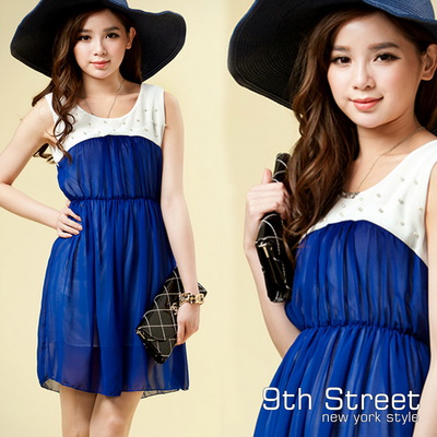 【9th.Street】千頌伊款鑲珍珠收腰雪紡洋裝