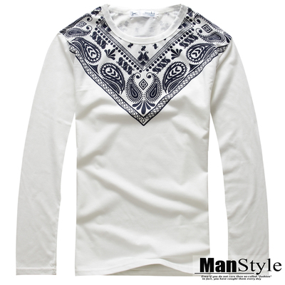 【01B6035】領口變形蟲圖藤民族風長袖男T恤。韓版街頭運動風休閒風/白色/藍色