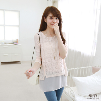 糖罐子-雙弧車線蕾絲假兩件雪紡衫(共二色)
