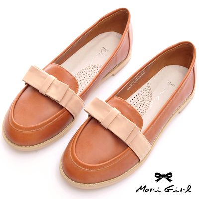 Mori girll撞色拼接蝴蝶結素面平底牛津鞋*經典棕