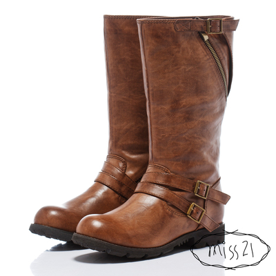.鞋款品名:miss 21 俐落騎士 雙皮帶釦環帥氣拉鏈中筒靴-率性咖