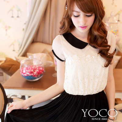 東京著衣-YOCO 網紗花朵圓領細百褶洋裝-S.M(共一色)-3028871