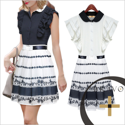 撞色小領層次荷葉袖拼接雪紡印花小洋裝 共二色 Bravo