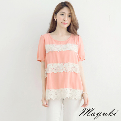 東京著衣-MAYUKI 綴蕾絲條紋雪紡上衣-S.M(共二色)-4007052