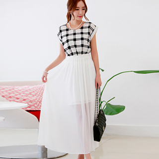 【菟絲花】韓版蝙蝠袖格子拼接修身雪紡長裙(大尺碼)