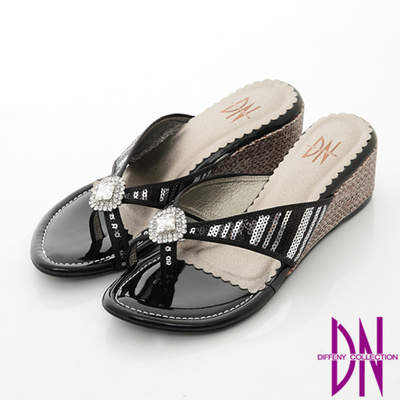 DN 性感搶眼-方鑽珠片夾腳小坡跟涼鞋-黑