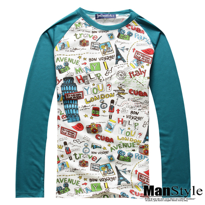 ManStyle潮流巴黎塗鴨滿版拼接袖長袖男T恤商品網址: