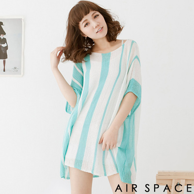 AIR SPACE 拼色條紋五分袖長版針織衫上衣(休閒藍)
