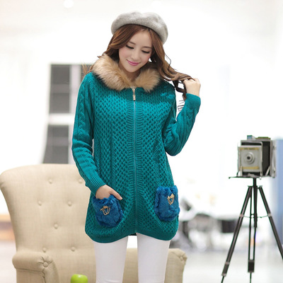 兔毛口袋菱形格毛領連帽加絨毛衣外套(湖綠色)-Joli-neon