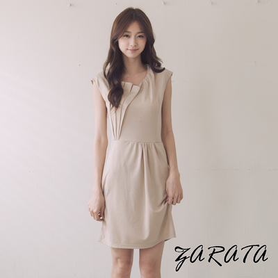 【ZARATA】洋裝-無袖壓摺縮腰口袋長版洋裝-卡其色