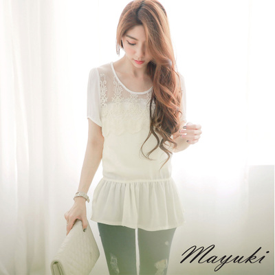 東京著衣-MAYUKI 透膚蕾絲拼接小裙襬上衣-S.M(共二色)