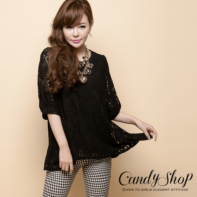 CANDY小舖 雙層蕾絲簍空蓬袖傘狀娃娃上衣(黑色)