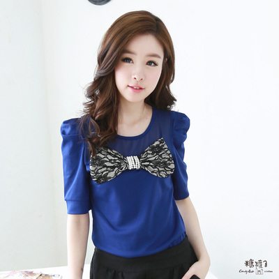 • 珍珠蕾絲蝴蝶結突顯整體重點拼接的雪紡布料柔和了線條感,穿上牛仔短褲不經意地透露出時尚的優雅品味與穿著質感喔~