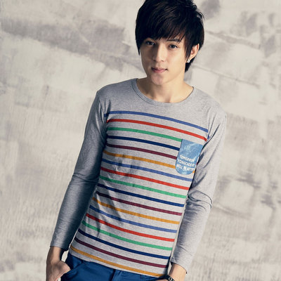 小猴子的賣場 韓版橫條多彩印花口袋長袖T恤-二色商品網址: