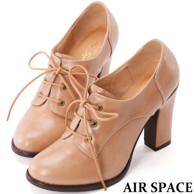 AIR SPACE★英式典雅~光澤羊紋繫帶粗跟裸靴-粉