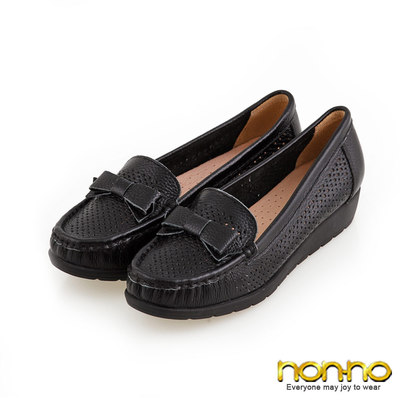 nonno 舒適滿分 網洞蝴蝶結真皮楔型樂福鞋-黑