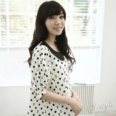 撞色領點點蝴蝶結泡泡袖雪紡衫-I-sTyLe