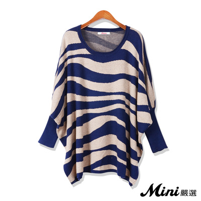 斑馬條紋寬鬆蝙蝠袖套頭加厚毛衣(寶藍)-Mini嚴選