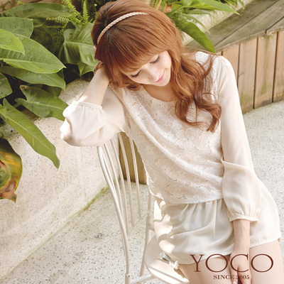 東京著衣【YOCO】☆蕾絲拼荷葉傘襬雪紡上衣 (共二色)