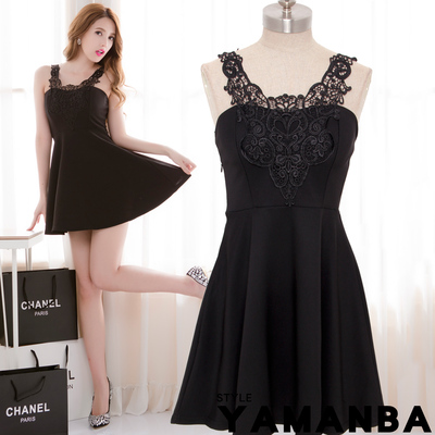 黑色刺繡蕾絲肩帶傘形洋裝-Yamanba