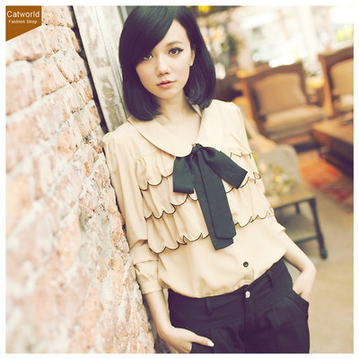 Catworld附蝶結綁帶層次黑邊波浪襯衫杏色