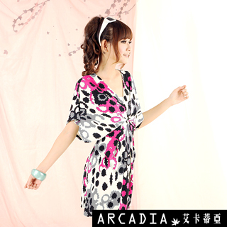 【ARCADIA】中大尺碼-睛艷印花V領蝴蝶袖洋裝(桃M)