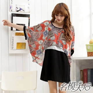 【名模天后中大碼】假兩件古典風圖印造型洋裝(磚紅)