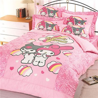 日本三麗鷗正式授權的My Melody&Kuromi友情萬歲純綿寢具,本次設計為A版為My Melody&Kuromi主圖設計,再加上C版亂花設計搭配。