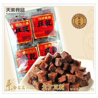 大丁豆乾為蔡天素先生精心研發,歷經三十五的傳統小零嘴。廣受社會大眾觀迎,至今不墜。其外呈丁狀方塊片,微硬,,輔以特殊佐料,香Q爽口,保證令人回味無窮。