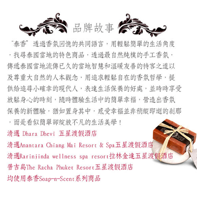 商品訊息功能: 100%純手工製造添加山羊奶柔嫩身體/臉部肌膚添加草本精油香氛榮獲泰國清邁設計大賞泰國五星度假酒店指定使用