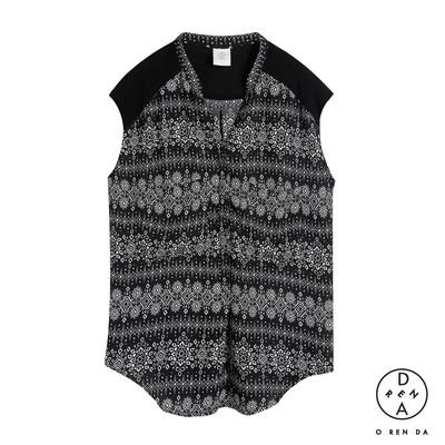 ORENDA-圖騰印花時尚肩拼色襯衫-S.M.L-黑