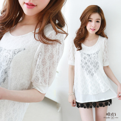 糖罐子-貓頭鷹拼接蕾絲棉衫