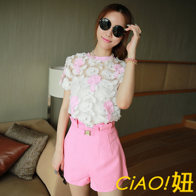 立體花朵緹花網紗短袖上衣 (粉色)-CiAO妞商品網址: