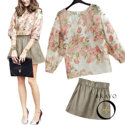 歐根紗印花圓領襯衫+亞麻純色短裙套裝 Bravo商品網址: