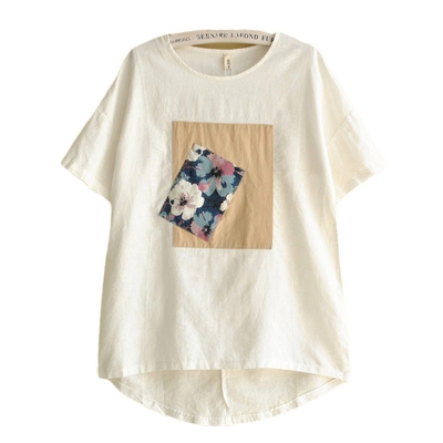 拼布短袖棉麻上衣(共三色)Fei Fei