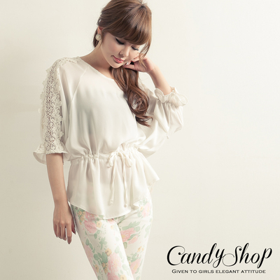 CANDY小舖 大圓領袖上簍空蕾絲腰抽繩上衣(白色)