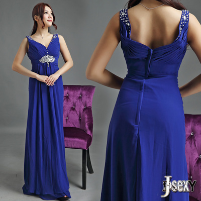 深V壓摺美胸寶石長禮服(寶藍)-D.J SEXY